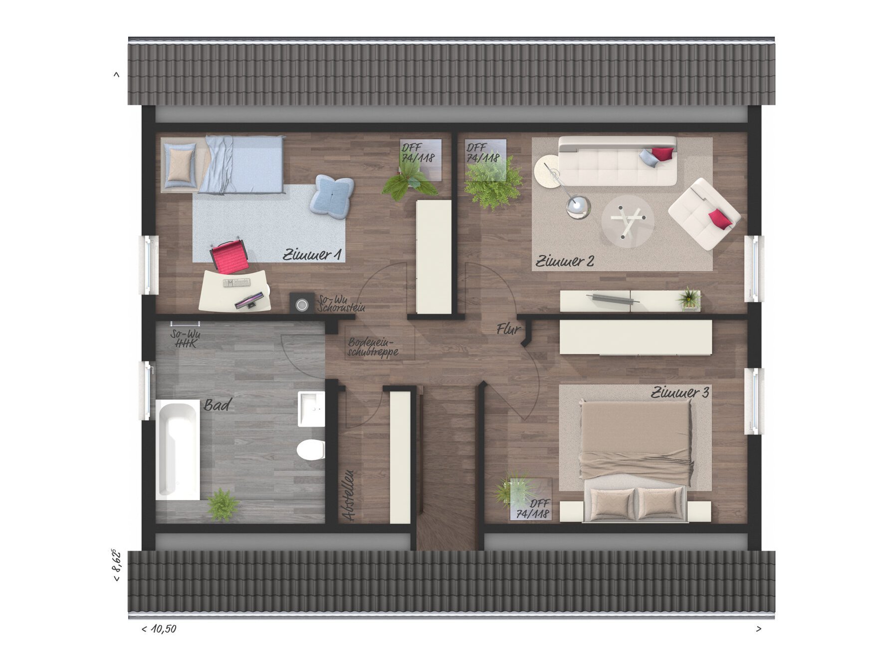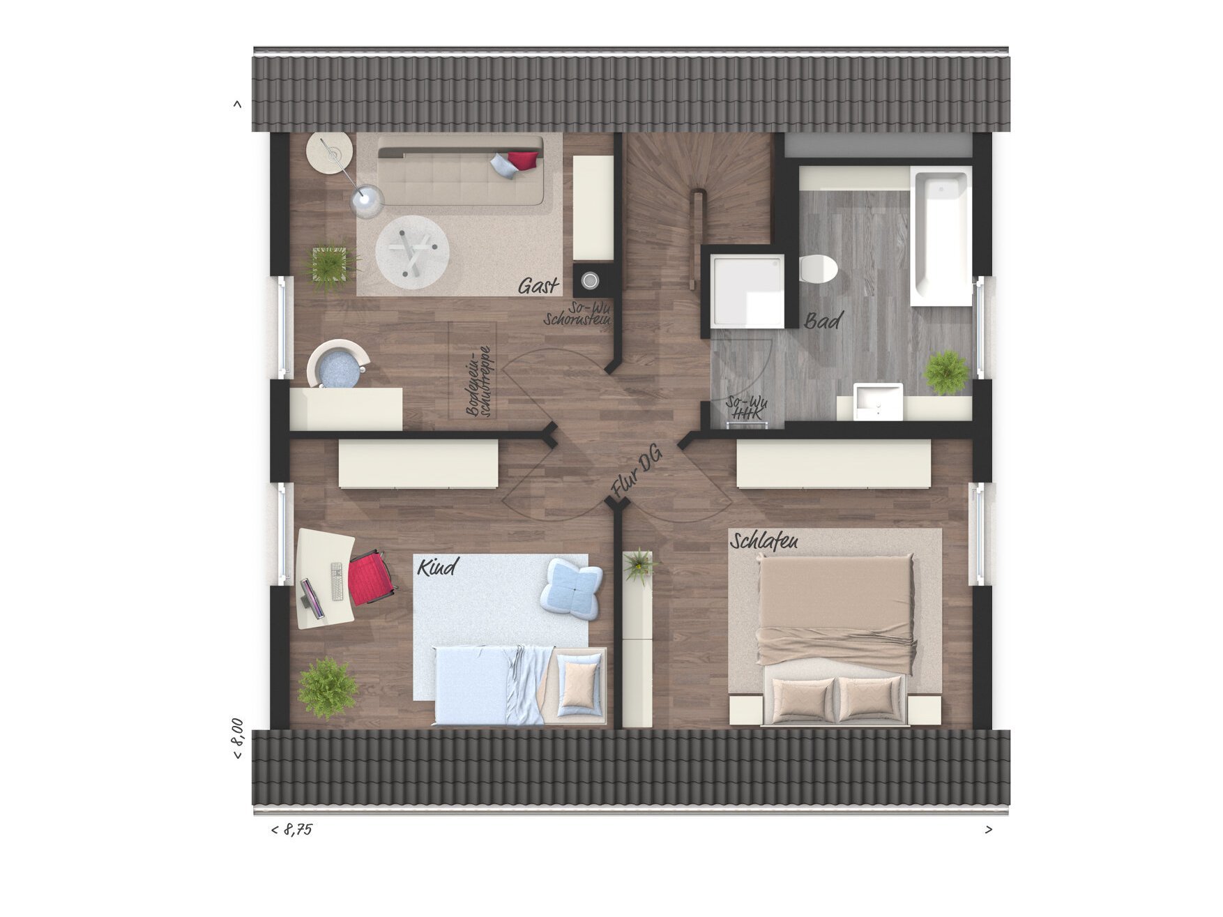 Das kleine Haus "Raumwunder 100" macht seinem Namen alle Ehre! Auf rund 70 Quadratmetern Grundfläche erhalten Sie 99 Quadratmeter Wohnfläche, die sich sehen lassen können. Angefangen beim lichtdurchfluteten Wohnbereich über gemütlicher Essecke bis hin zu Ihren Rückzugsorten im Dachgeschoss.